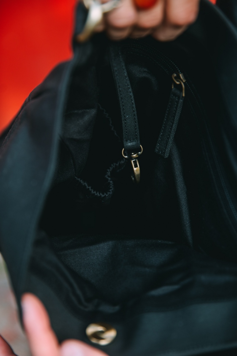 Väskan har ett stort fack inuti med nyckelhållare samt ett fack med dragkedja. Även två glasflaska inuti i sidorna Magnet längst upp,