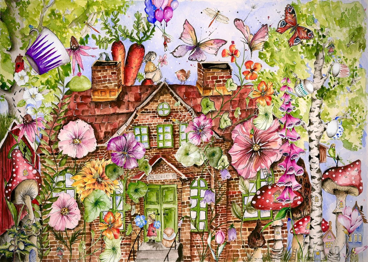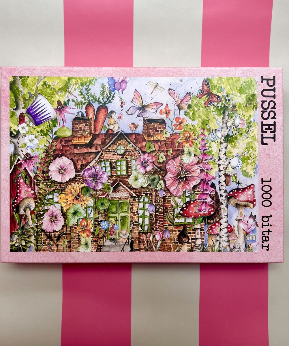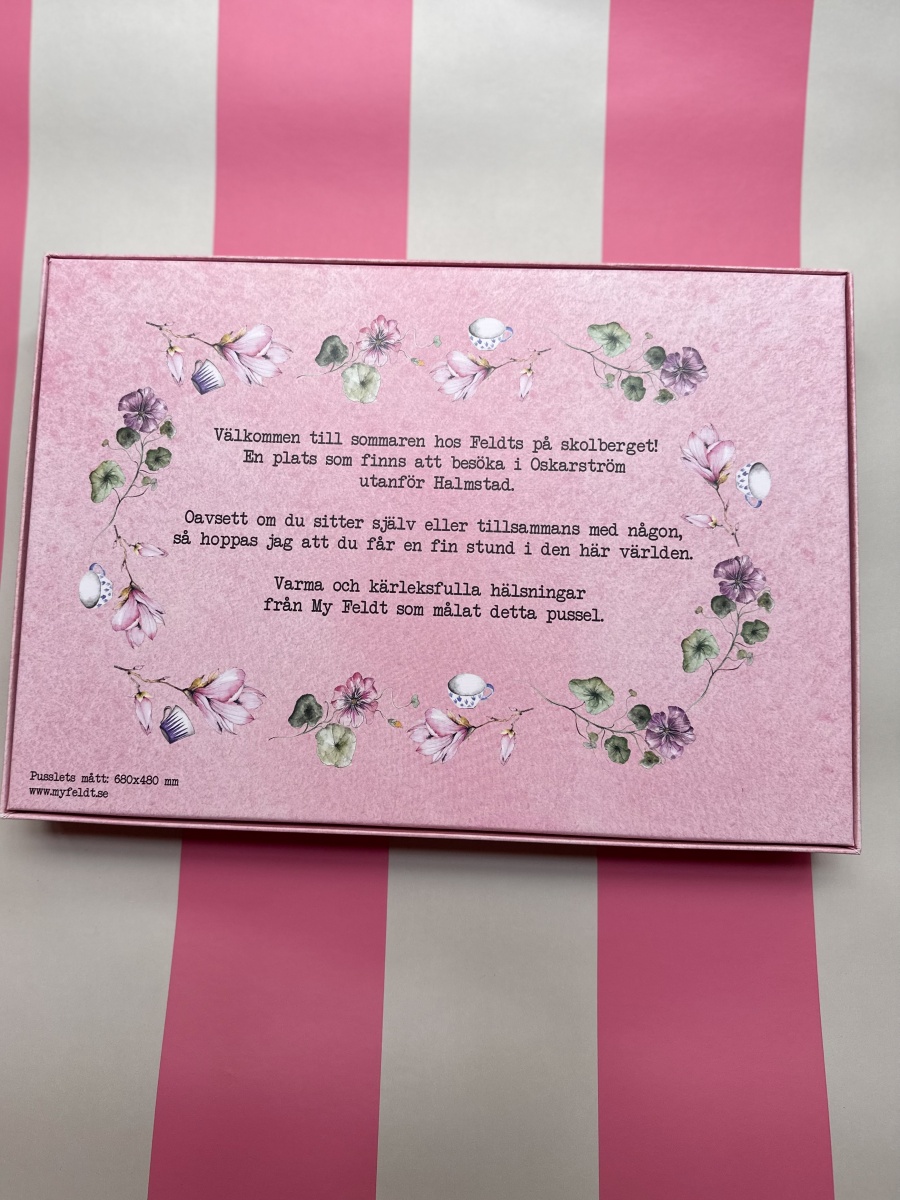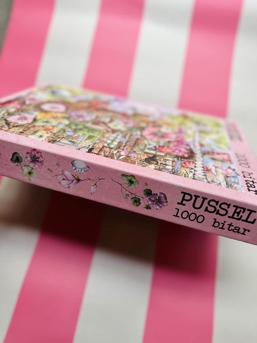 Pussel med 1000 bitar som kommer i en hård kartong.